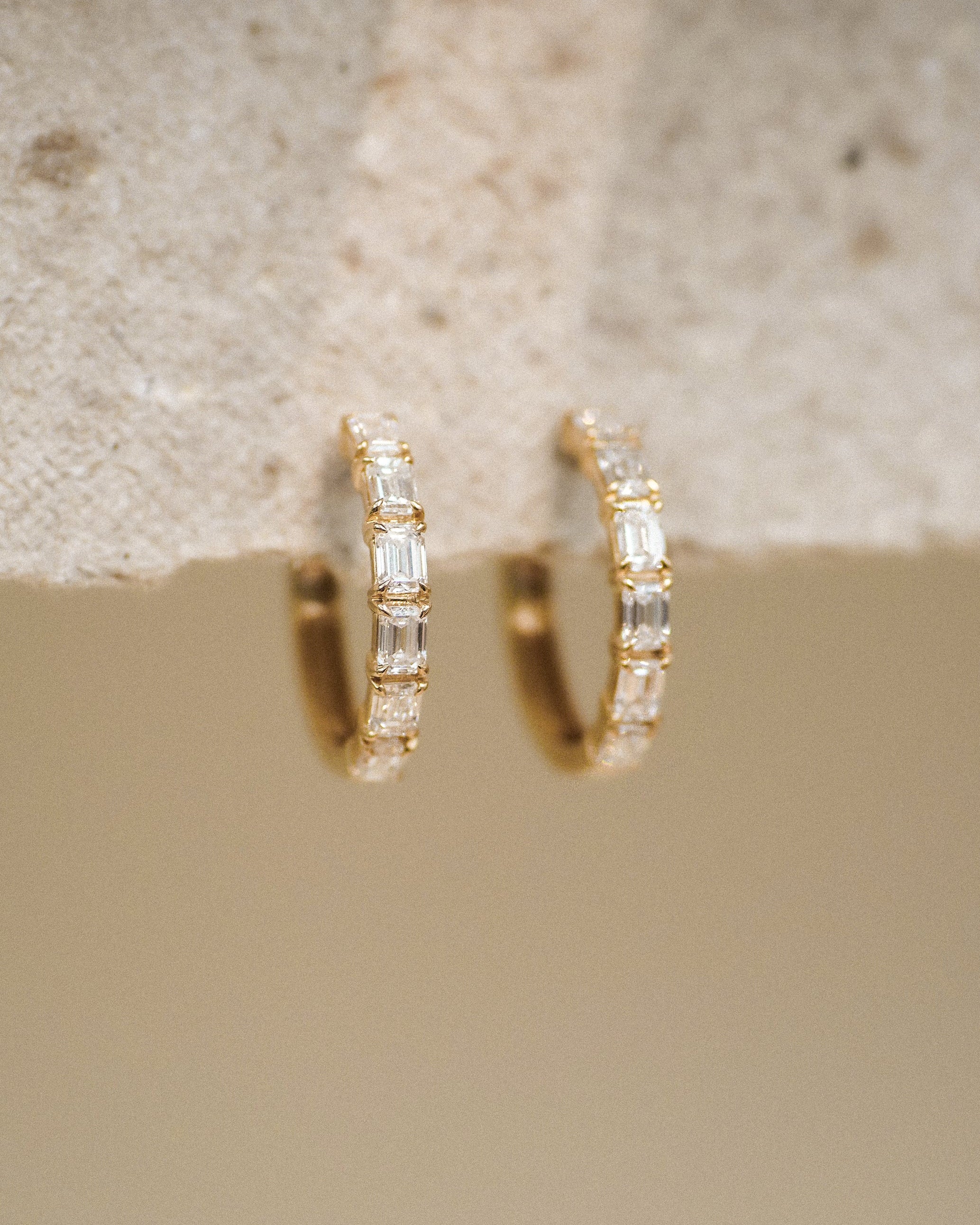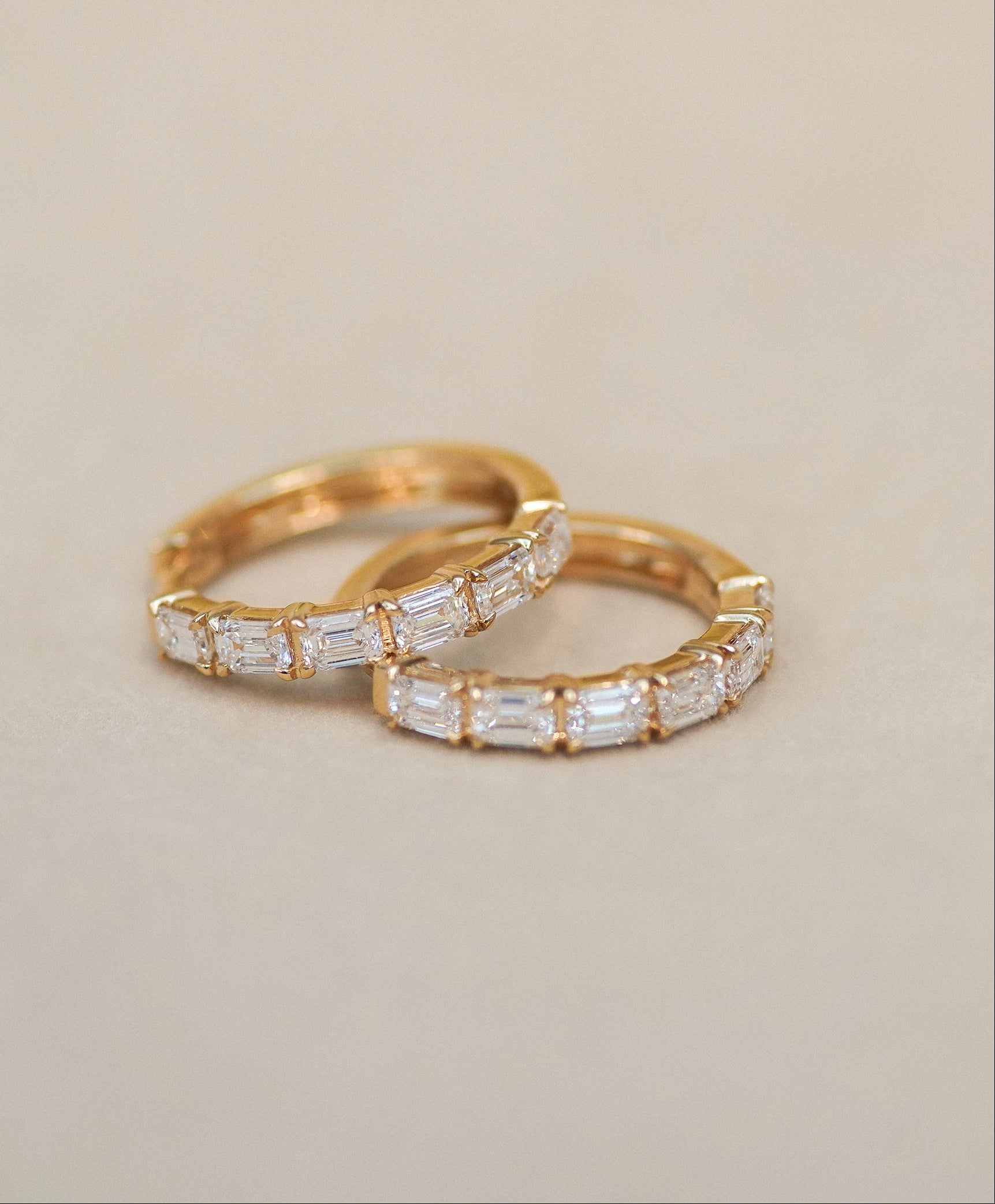 Emerald-cut lab-grown diamonds set along a sleek 14K solid gold huggie. Structured sparkle with a refined, everyday edge.