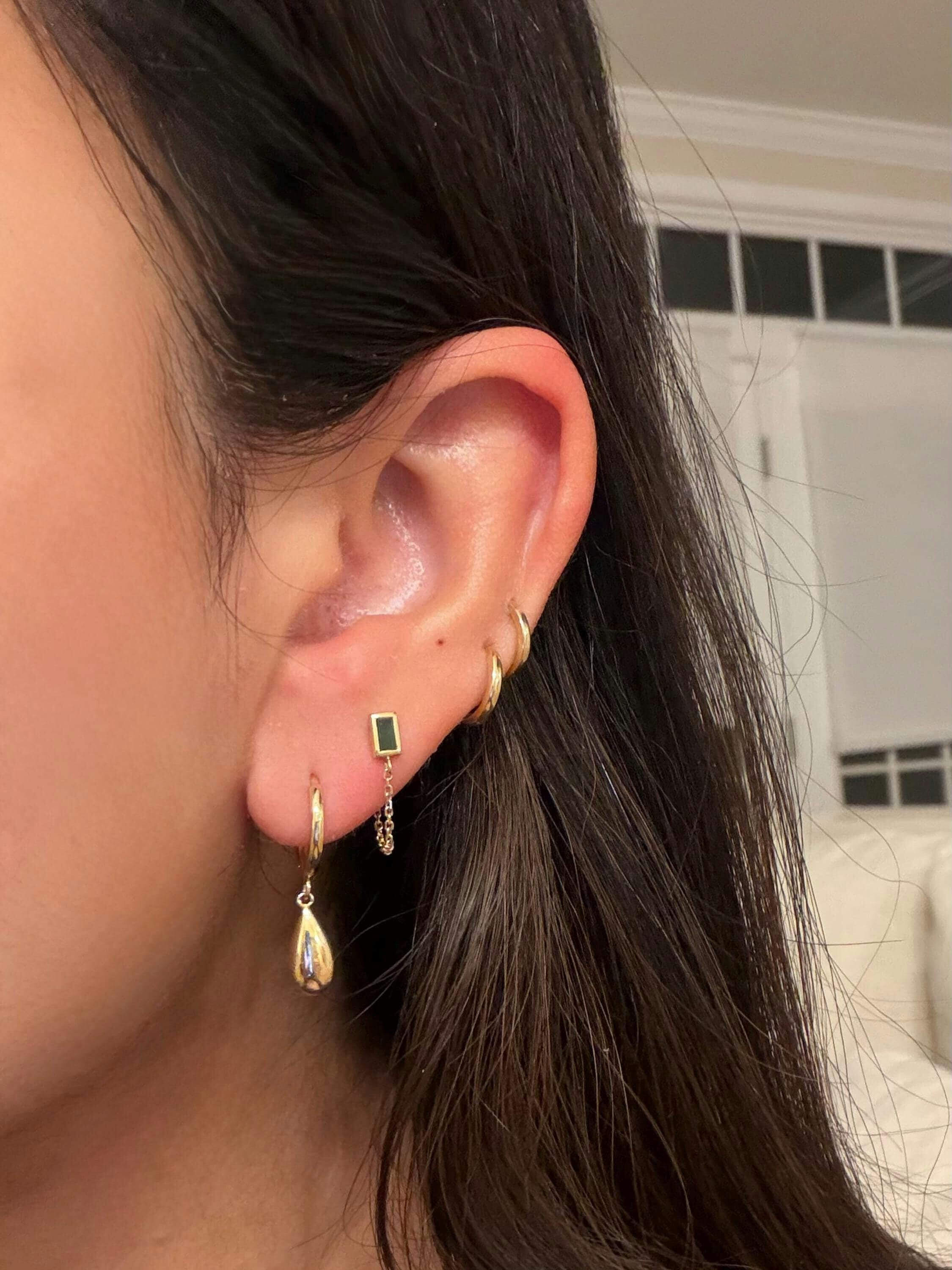 14k solid gold teardrop drop huggie earrings with a sleek, polished finish. Lightweight and versatile, these hoops add an understated elegance to any look. Perfect for everyday wear or special occasions.