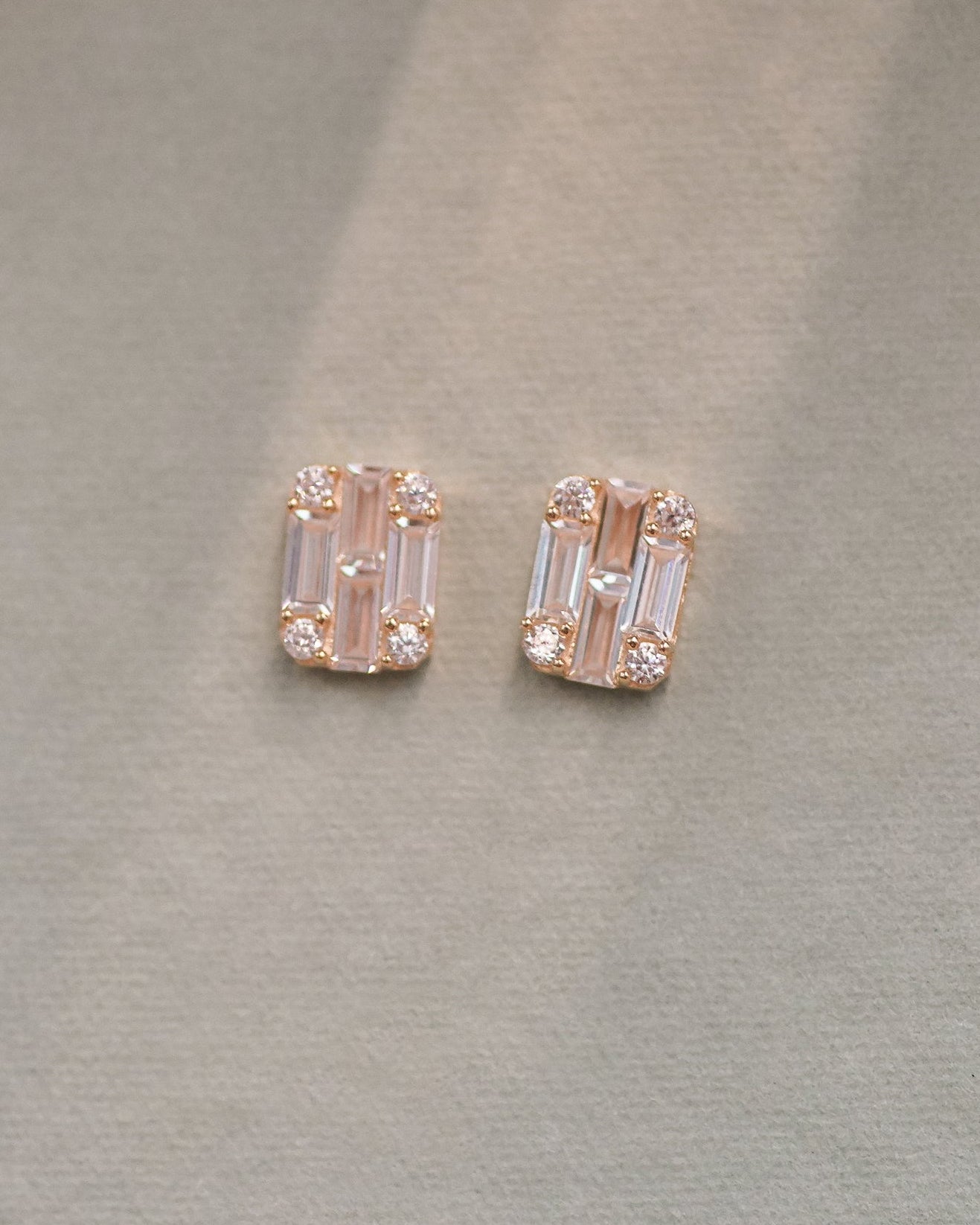A pair of baguette-cut CZ stud earrings secured in a clean prong setting. Crafted in 14K solid gold for a sharp, modern look with refined sparkle.