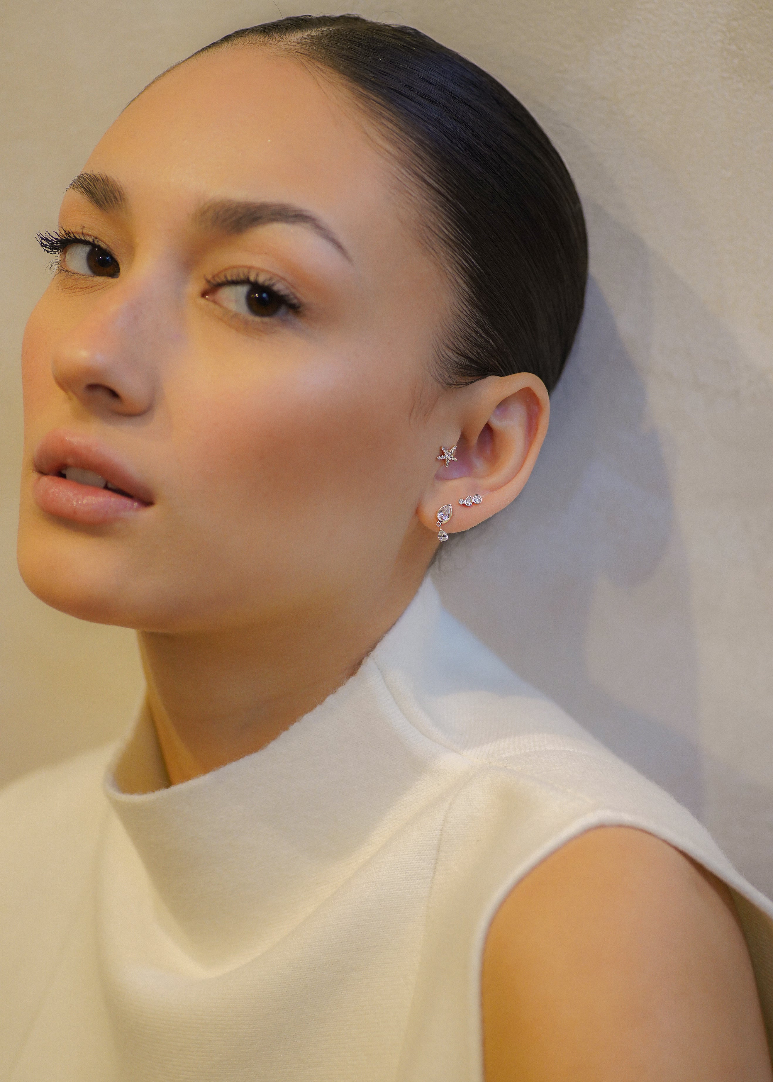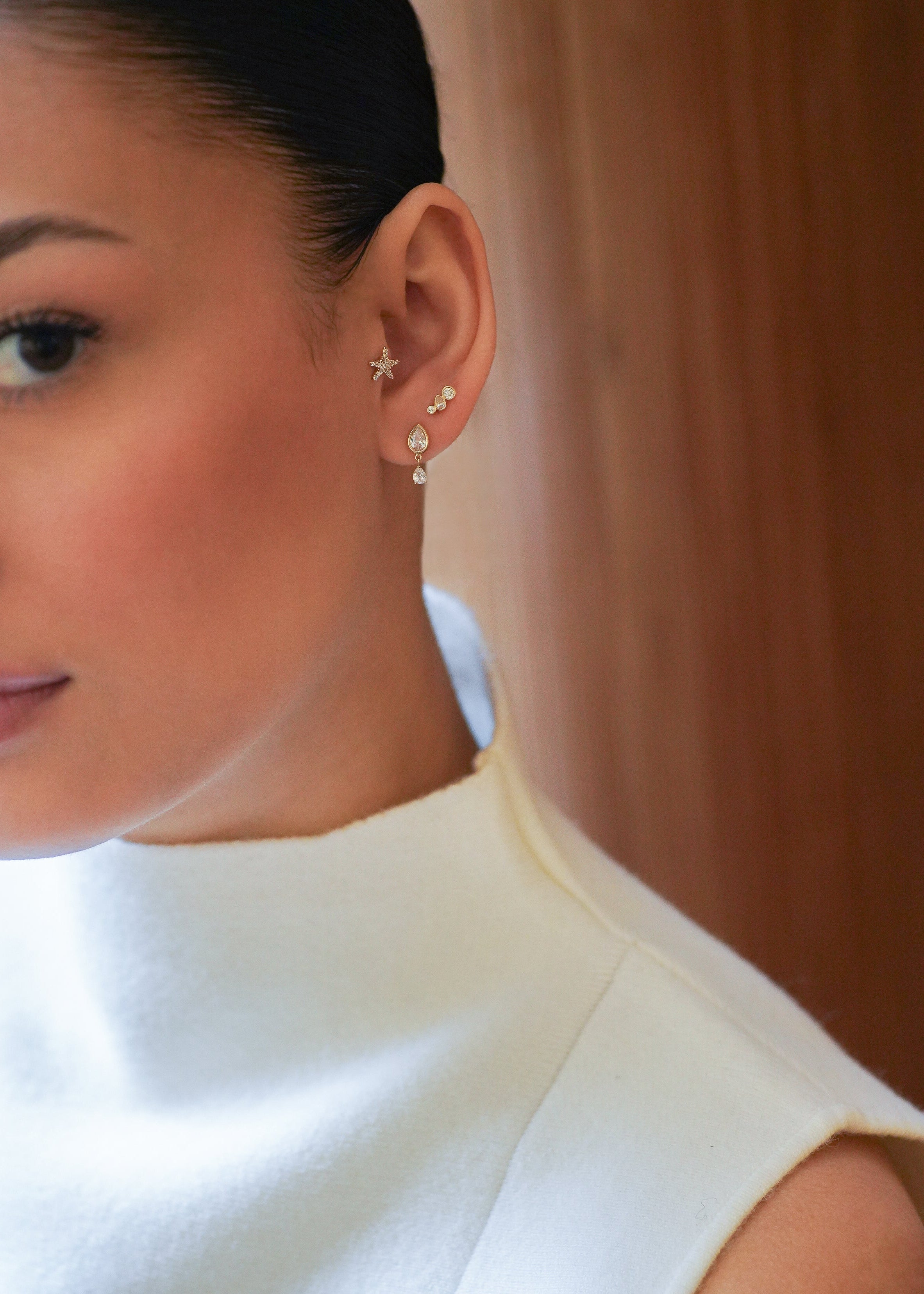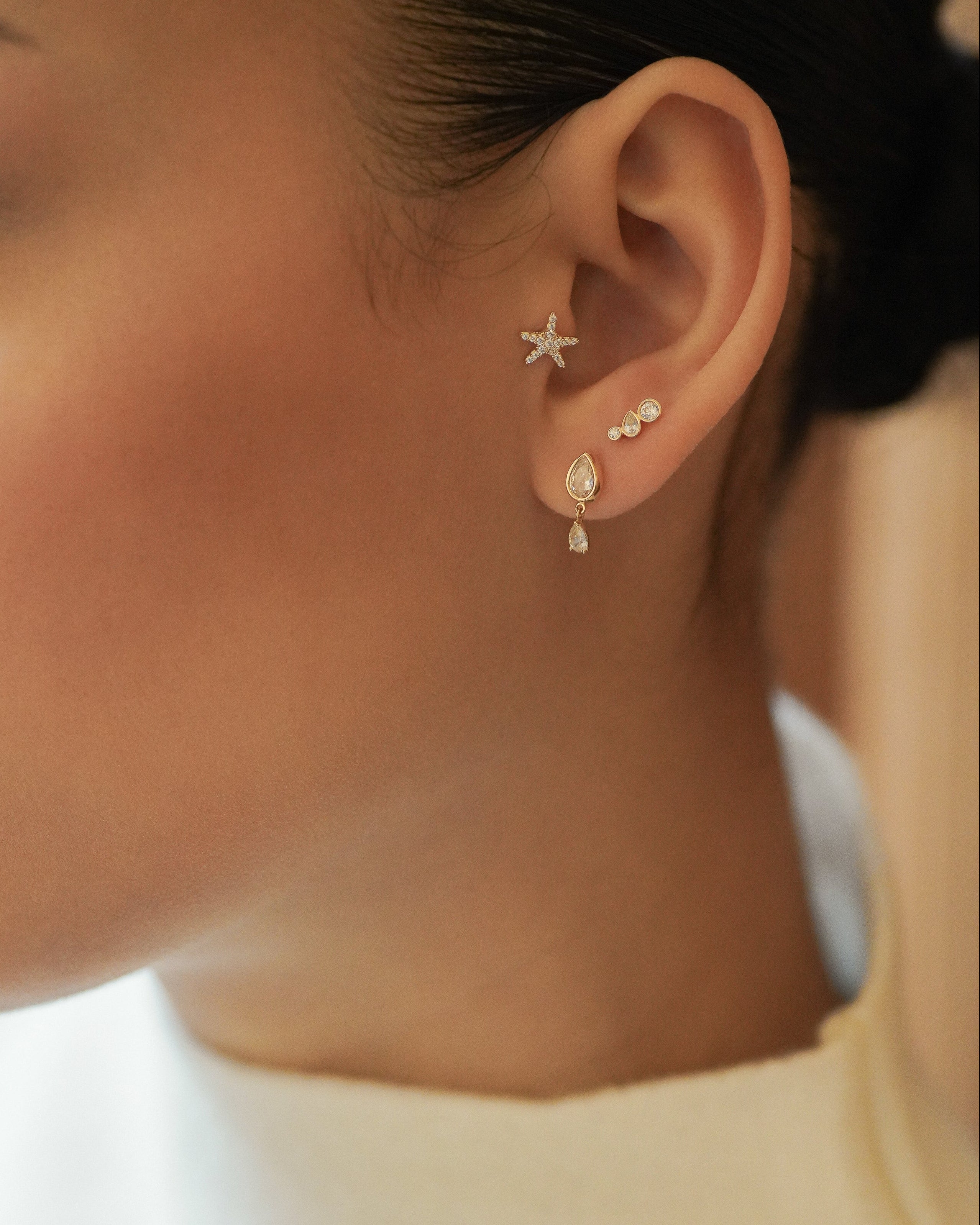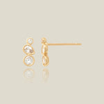 A modern trio in 14K solid gold. Three bezel-set stones — round, pear, round — arranged in a clean vertical line for balanced sparkle. Sleek, secure, and designed for everyday wear.