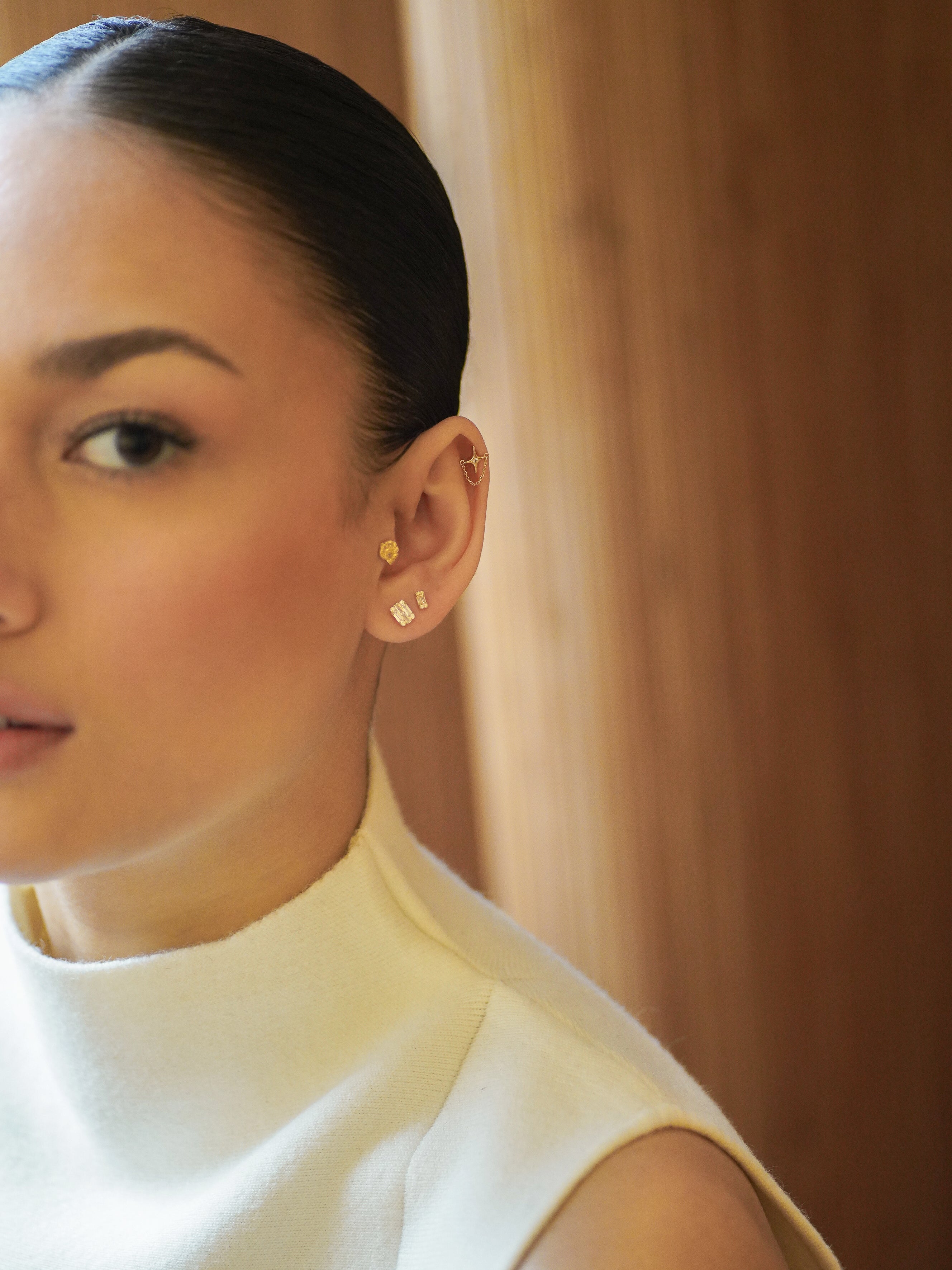 A sculpted north star silhouette in 14K solid gold, finished with a delicate connecting chain for subtle movement. Designed to add edge and dimension to your curated ear stack.