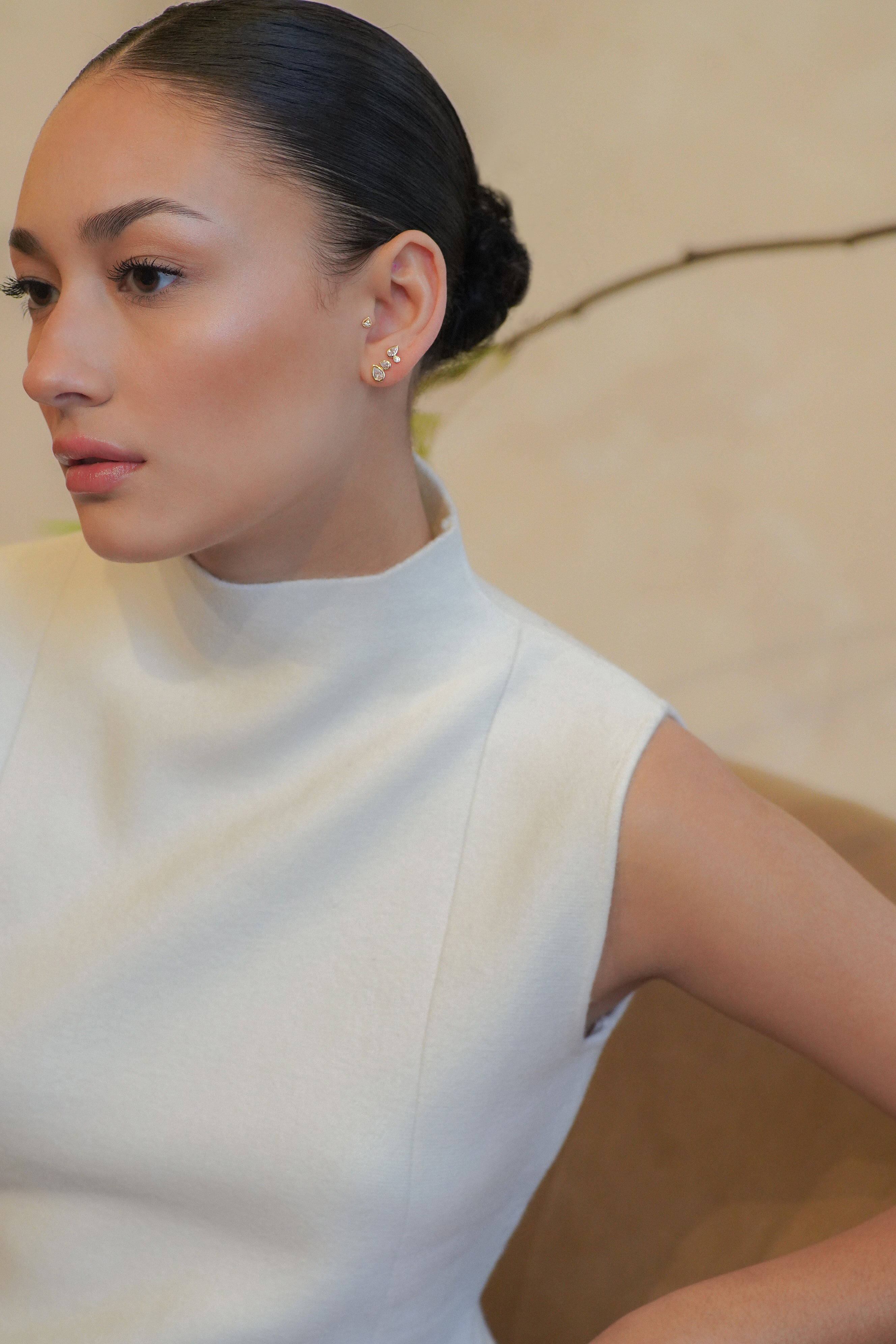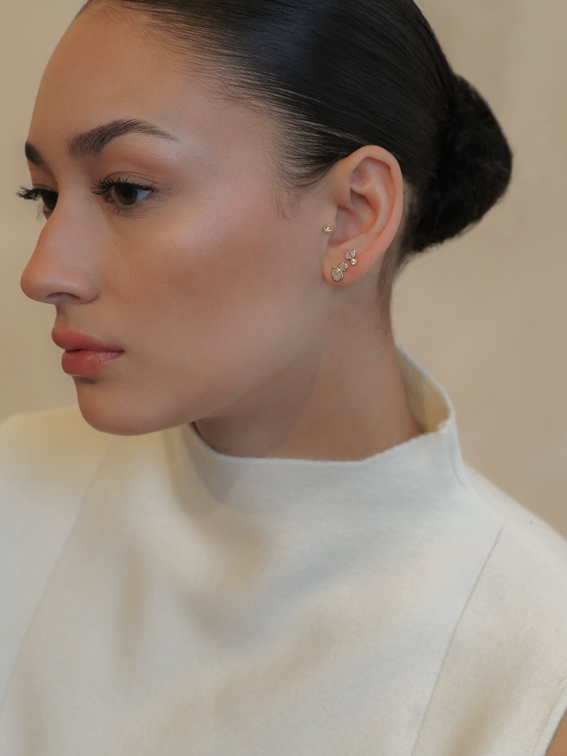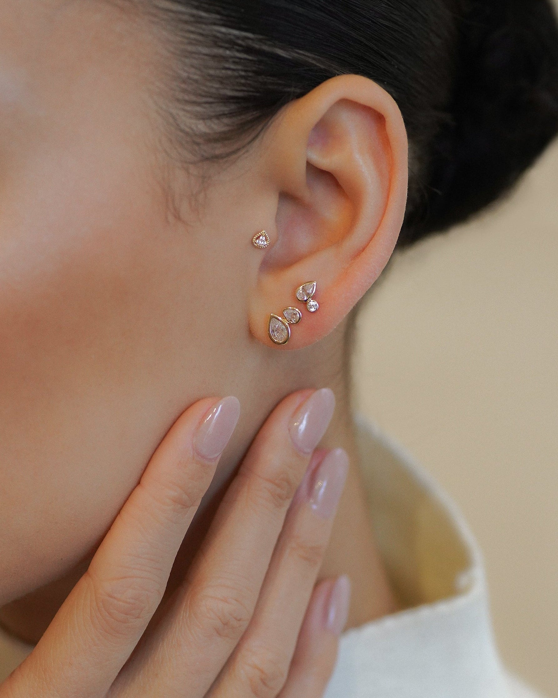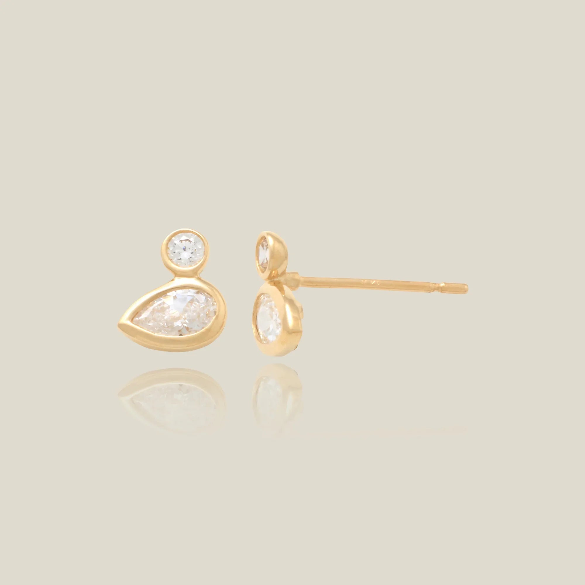 Pear-cut CZs paired with round bezel accents, set in smooth 14K solid gold. A modern shape with a soft, balanced sparkle.