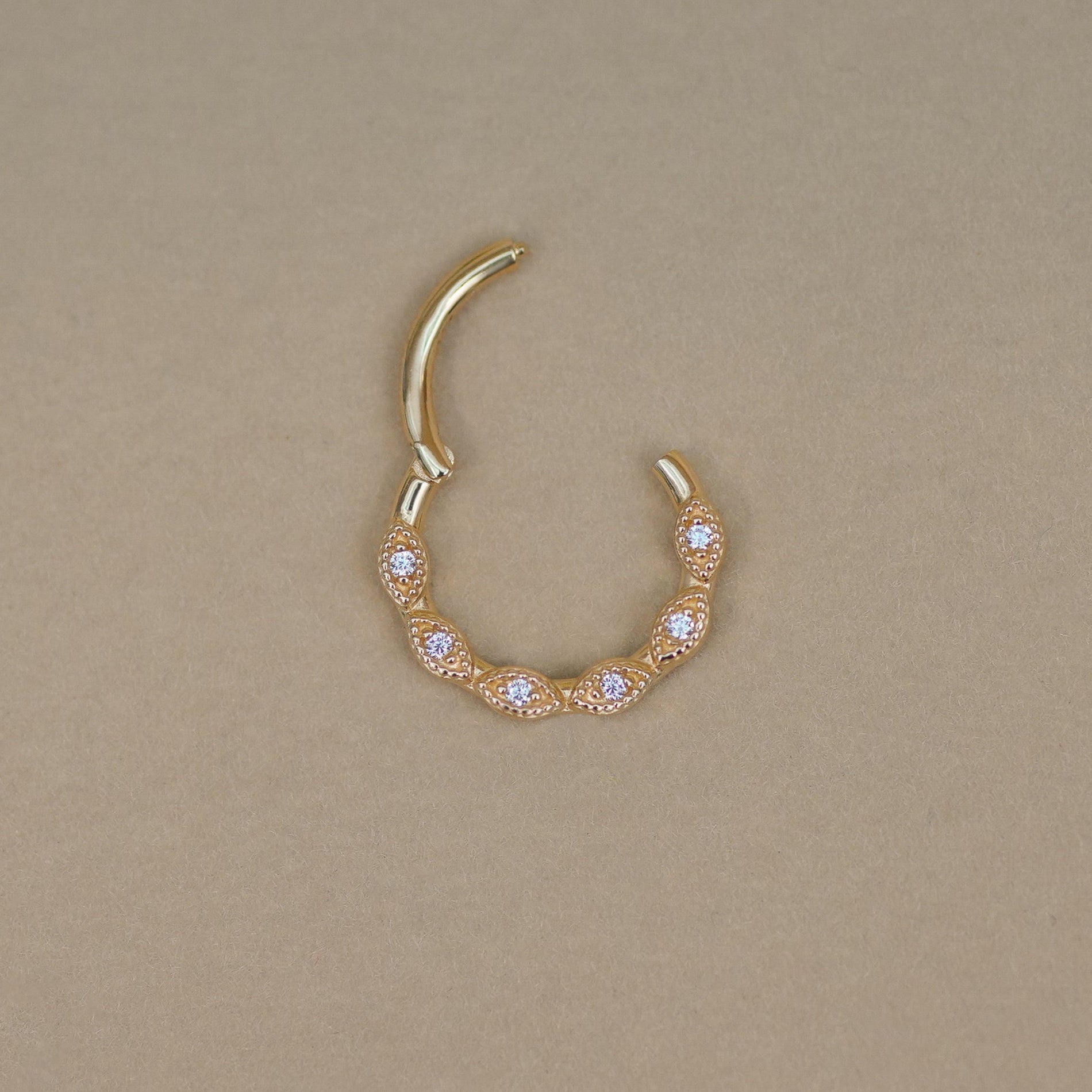 Delicately crafted in 14K solid gold, the Braided Evil Eye Clicker Hoop features a unique braided design with CZ accents. Perfect for lobe, helix, daith, or septum piercings, this clicker adds a subtle touch of protection and style.