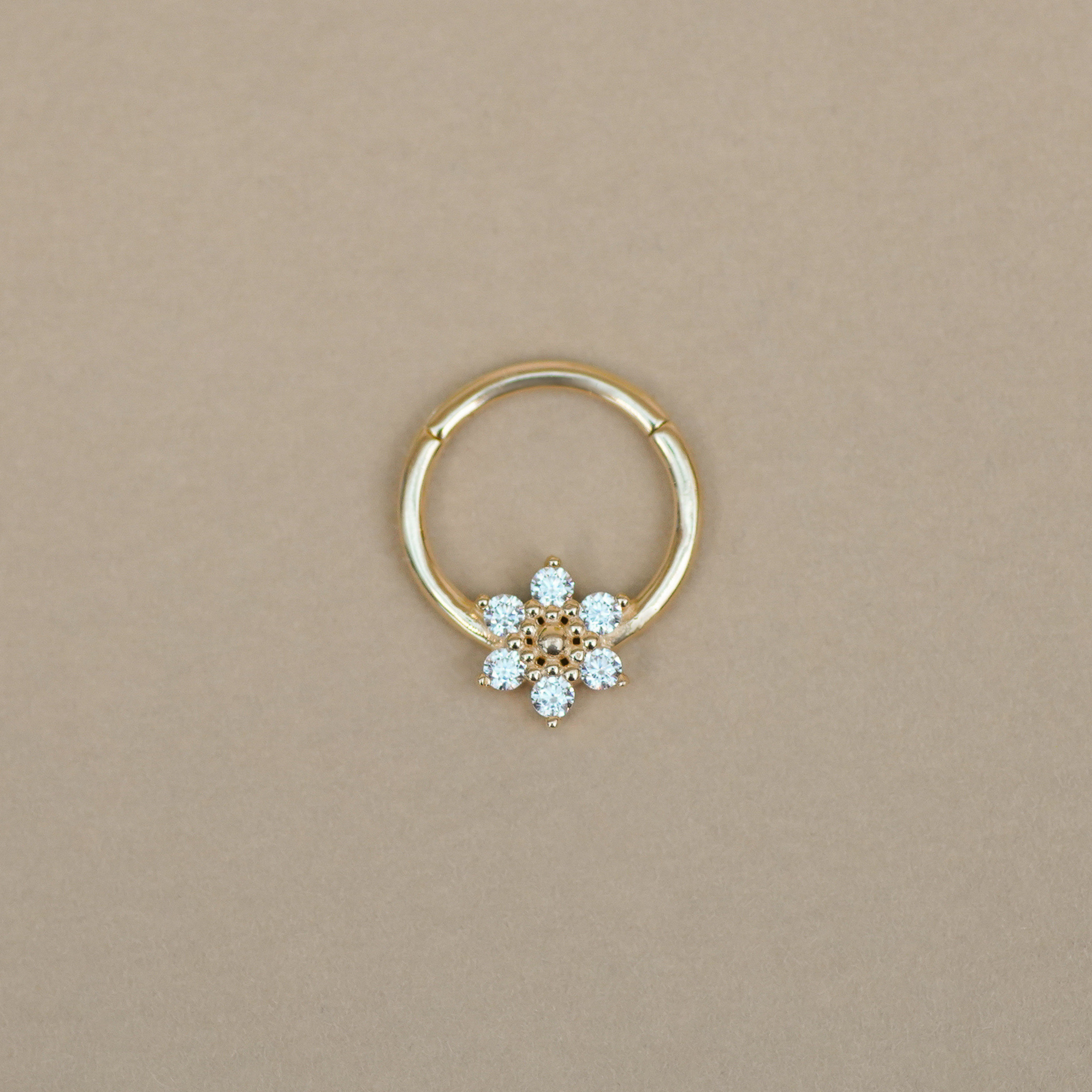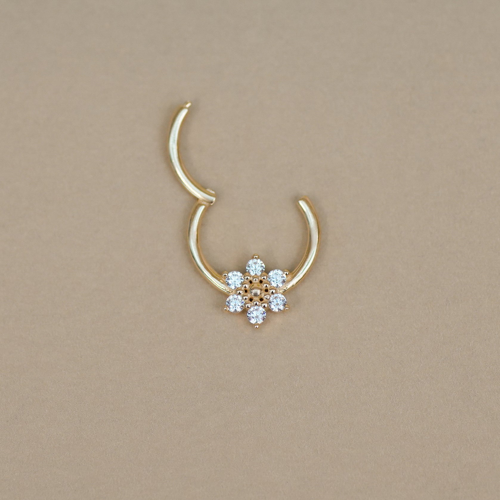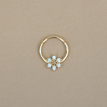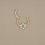 Delicate and versatile, the Daisy Flower Hoop in 14K solid gold features a CZ-adorned floral design. Perfect for lobe, helix, daith, or septum piercings, this clicker hoop adds a touch of charm to any look.