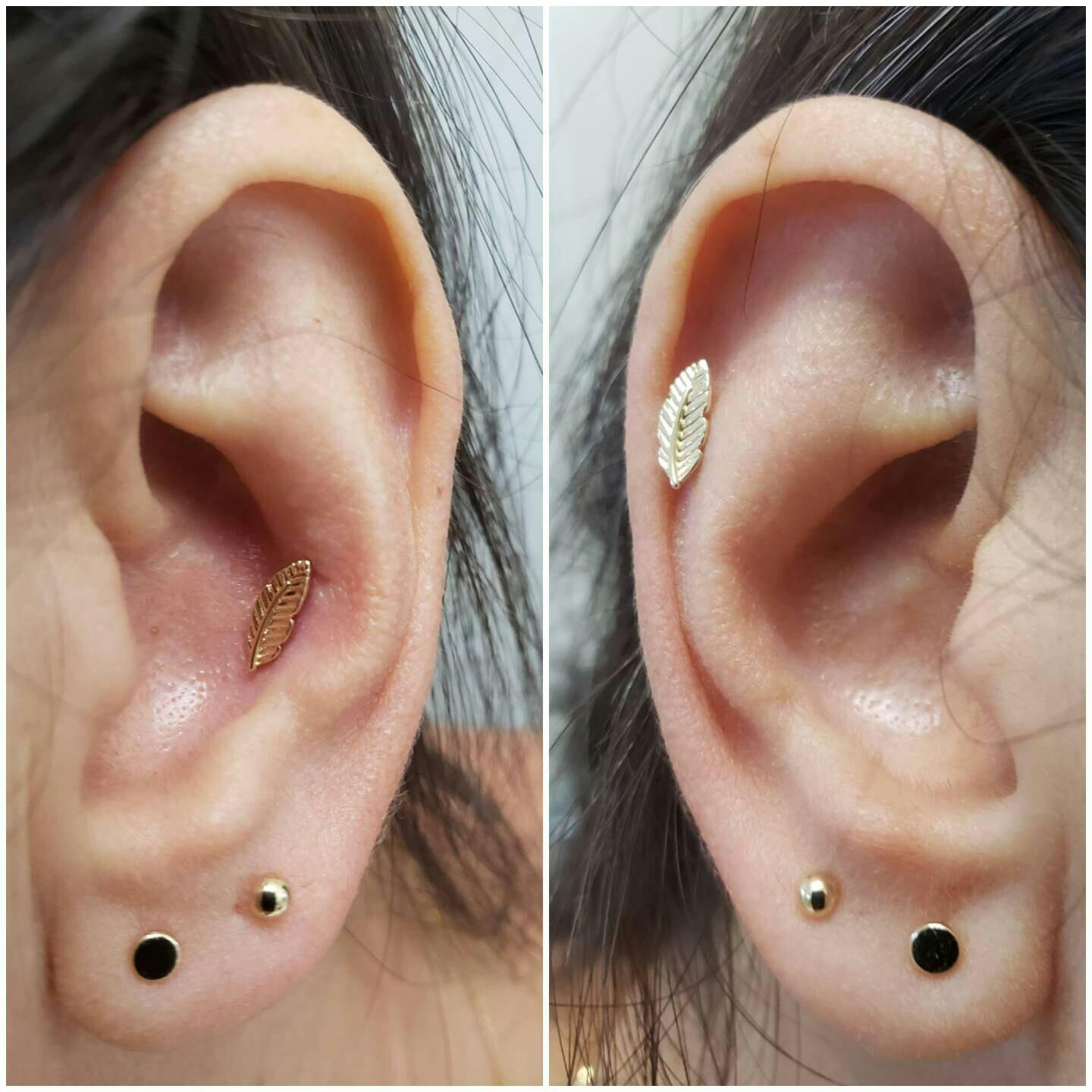 Just got these and I immediately cleaned them and put them in. I love the little feathers and how they look with my gold disks and half balls as pictured. They are the right size to fit in the fold of my low helix piercing but still look good in my conch on the other ear. I have purchased a handful of styles from this seller and the shipping is always fast and the quality is always good. They are nicer in person, very shiny. I only wish they had more right and left styles for symmetrical piercings like my lobes. The ball back is comfortable and the 18g is versatile. Please, more of these plain gold styles with no cz sparkly stuff!