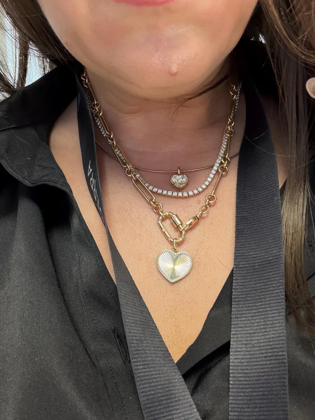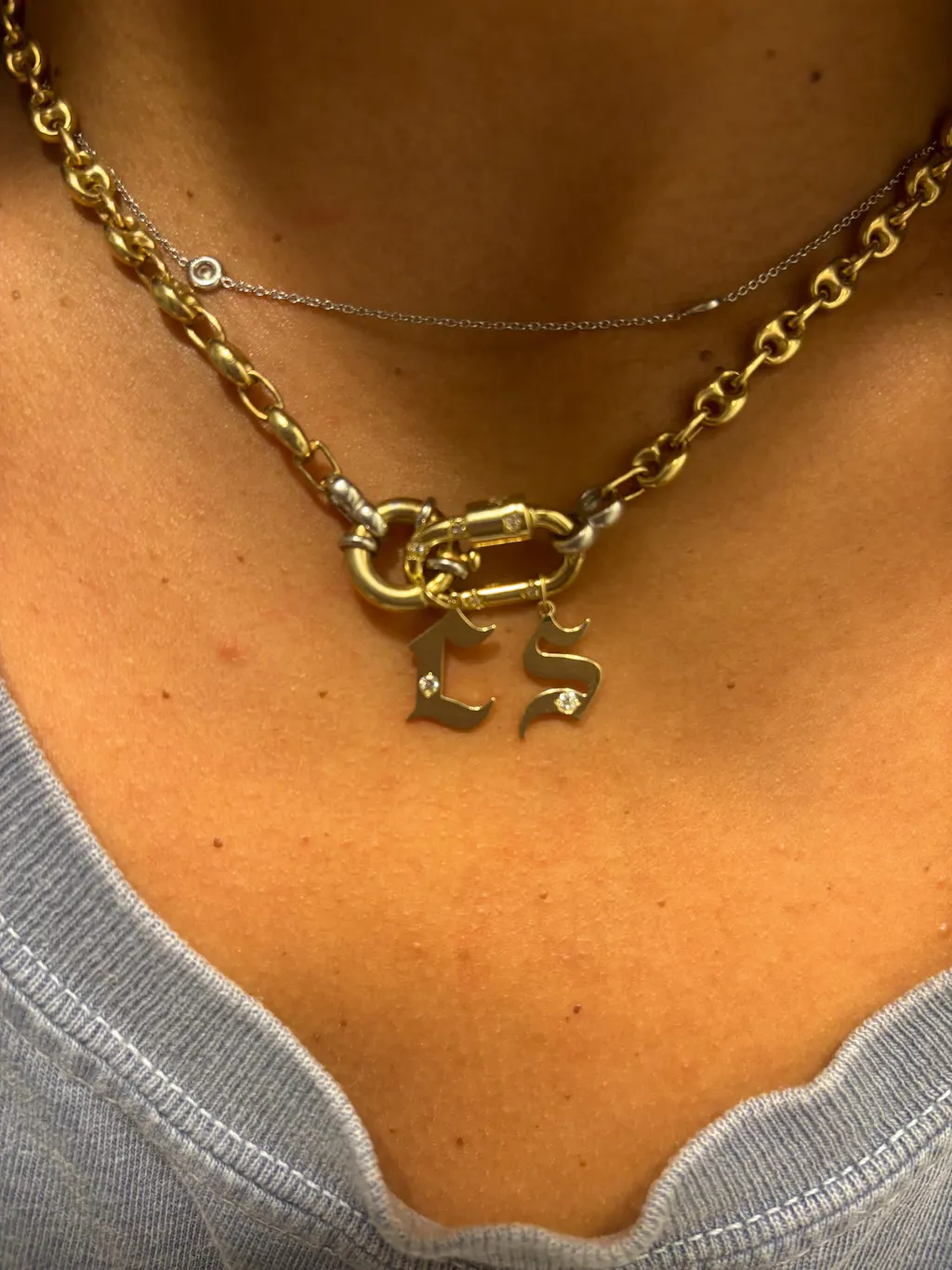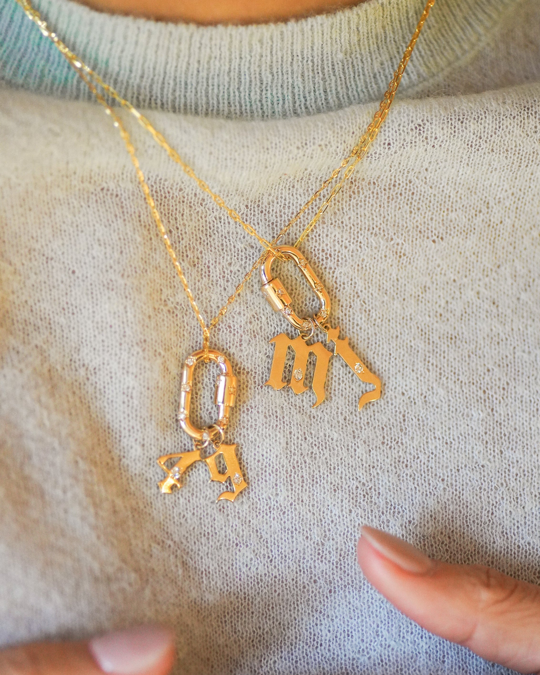 The Diamond Carabiner Charm Connector is a versatile 14K solid gold piece, accented with natural diamonds for a refined touch of luxury. Its secure screw-lock mechanism allows you to attach charms, pendants, or even link chains for a custom-stacked look.