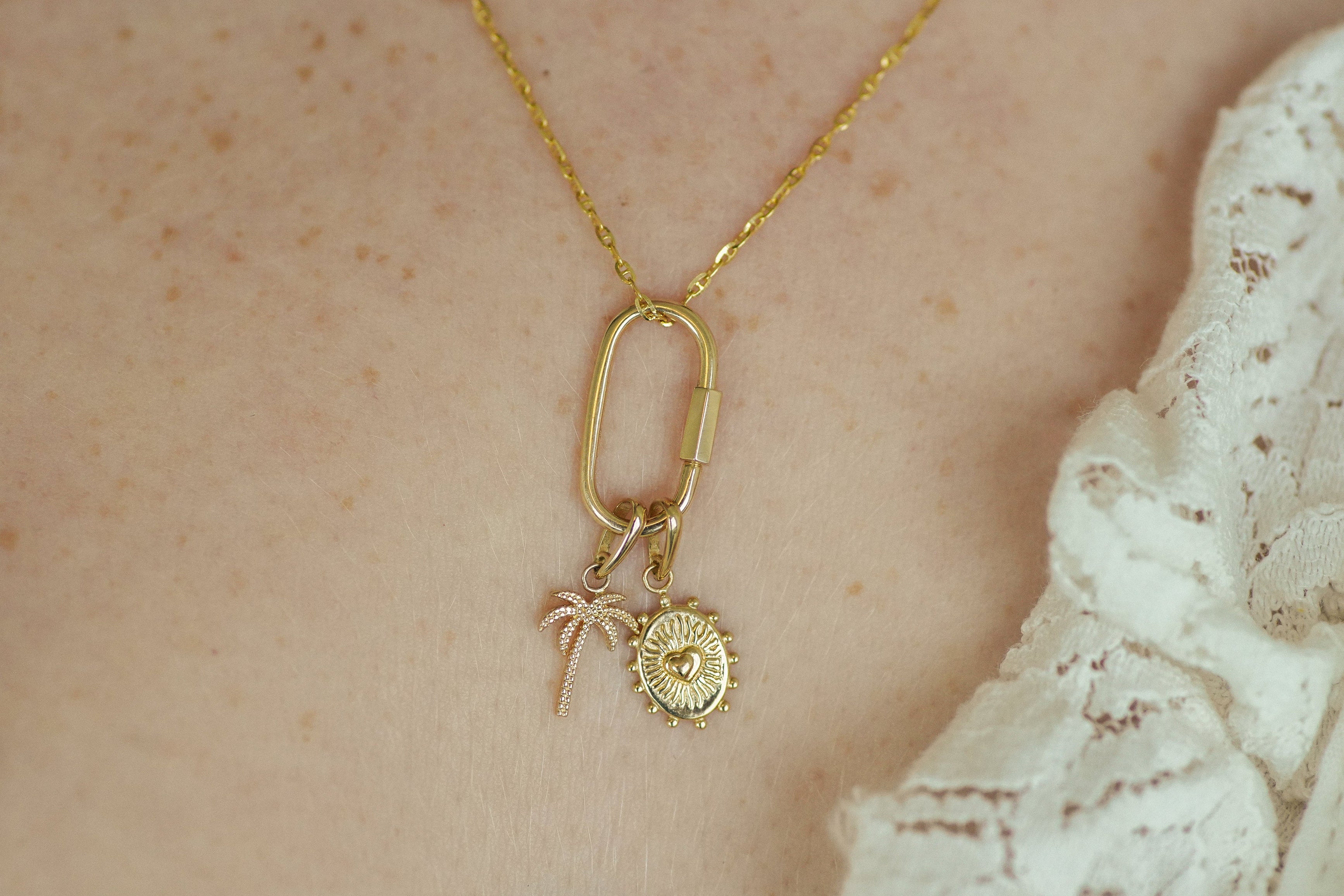 The Oval Carabiner Charm Connector is a versatile 14K solid gold piece designed for both style and function. Its secure screw lock mechanism allows you to attach charms, pendants, or link chains for a custom stacked look. The sleek oval silhouette makes it a timeless charm holder, perfect for personalizing your jewelry styling.